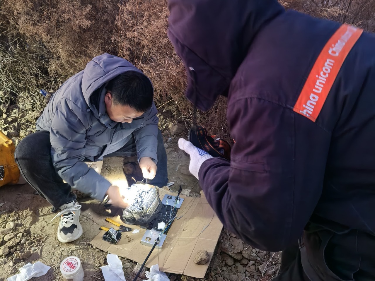 抢修队员深一脚浅一脚地穿梭在雪原之上,逐段排查光缆断点,找到故障点后便顶着寒风完成光缆熔接、测试。随后又赶往山上的基站,踩着湿滑的山路徒步攀登,对基站设备进行全面检修、调试……经过几个多小时的奋战,供给堂村的网络终于恢复畅通。“这么冷的天,这么快就把网修好了,辛苦你们了!” 村民们握着维护人员冻得通红的手连连道谢。